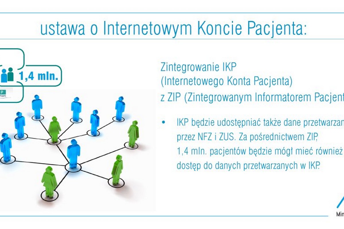 Zgodnie z przyjętą ustawą, będzie mogło zacząć działać Internetowe Konto Pacjenta (IKP) oraz Zintegrowany Informator Pacjenta (ZIP). „Dzięki nim każdy pacjent będzie miał dostęp on-line do informacji na temat wystawionych mu recept, skierowań, zleceń na wyroby medyczne, udzielonych świadczeń i ich koszcie, wyborów lekarza, pielęgniarki i położnej podstawowej opieki zdrowotnej, a także e-zwolnień. IKP pozwoli też upoważnić inną osobę do dostępu do swoich danych medycznych lub informacji o stanie zdrowia. Ustawa wprowadza także jednolite standardy dla systemów informatycznych szpitali i jednostek prowadzących rejestry medyczne” – informuje resort zdrowia.