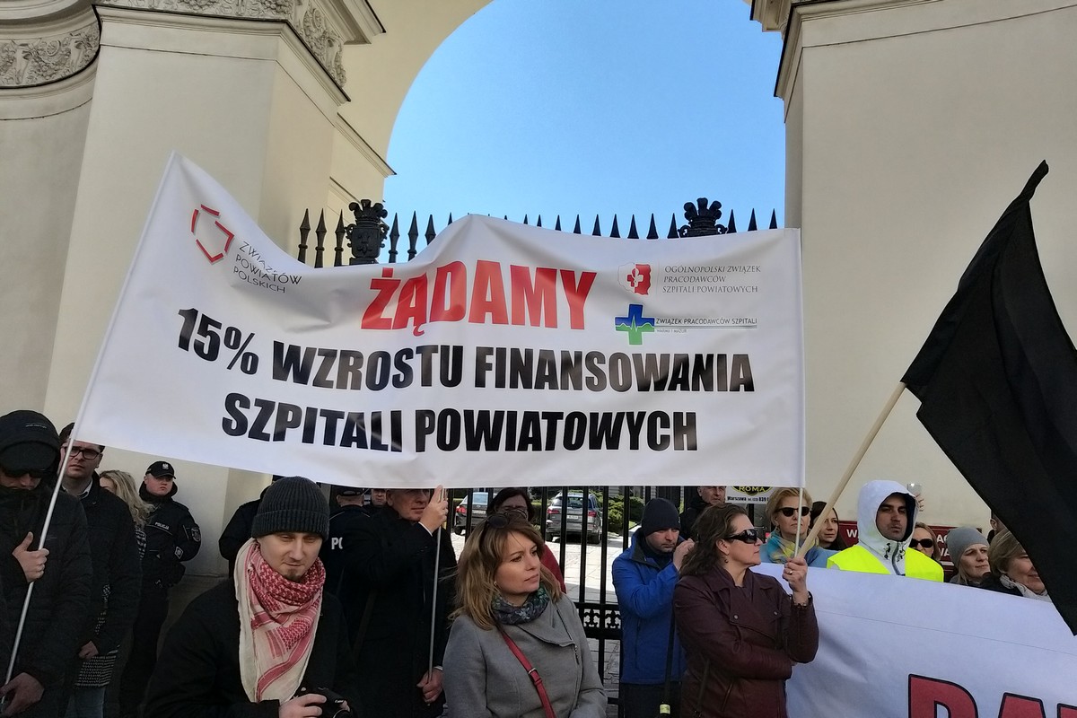 Przed Ministerstwem Zdrowia protestowali dyrektorzy szpitali powiatowych i przedstawiciele samorządów. „Naszym głównym postulatem jest uregulowanie płac wszystkich grup pracowników medycznych. Żądania płacowe nas dobijają, bo rządzący zapomnieli że w szpitalach nie pracują wyłącznie lekarze i pielęgniarki” – podkreślał Waldemar Malinowski, prezes Ogólnopolskiego Związku Pracodawców Szpitali Powiatowych.