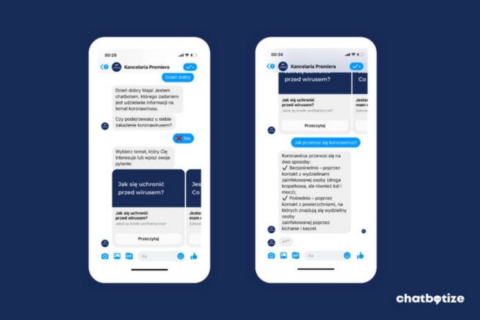 Polski startup Chatbotize stworzył chatbota, który automatycznie odpowiada na najważniejsze i najczęściej powtarzające się pytania związane z epidemią koronawirusa. Chatbot dostępny jest na oficjalnym profilu Kancelarii Premiera na Facebooku.