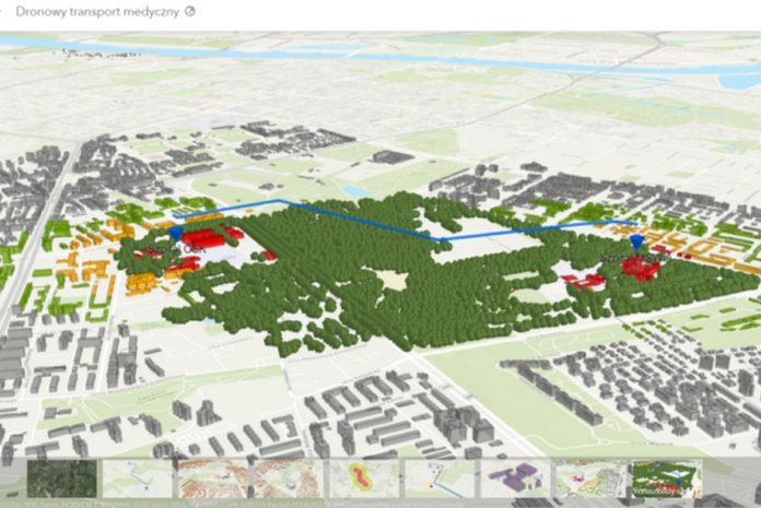 Dron wzbił się w przestrzeń powietrzną i pokonał trasę po wytyczonej mapie, do której analizę przeszkód i wyznaczenie stref bezpieczeństwa przygotowała Esri Polska. Firma opracowała również koncepcję modelowania 3D przestrzeni powietrznej.
